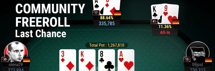 Vorerst bedeutet in dem Fall, dass wir aktuell an einem ähnlichen Format arbeiten, dass euch auch in Zukunft die Chance bietet, ohne eigenen Einsatz eine Bankroll aufzubauen. Kostenlos pokern könnt ihr zudem weiterhin jeden Dienstag und Samstag in unserer Freeroll Liga mit Preisen im Gesamtwert von $17.500.