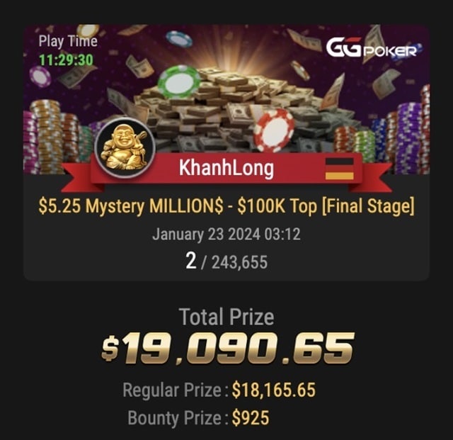 Weit vor der Entscheidung um den Turniersieg wurde die Top Bounty in Höhe von $100.000 ausgelost. Der glückliche Spieler war Alexandrovi4 aus Russland, der die Gold Chest bereits früh im Turnier für den Bustout des Österreichers Johnny Deep auf Platz 8.244 bekam. Sein eigenes Ausscheiden auf Platz 518 wird er also ganz sicher verschmerzen, denn inklusive Preisgeld und weiterer Mystery Bounties lag seine Gewinnsumme bei $100.418.https://blog-contents.com/de/wp-content/uploads/sites/10/2024/01/mystery-100k-bounty-1.mp4