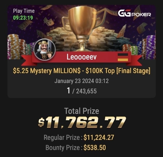 Am Montagabend stand bei GGPoker mit dem $5,25 Mystery MILLION$ das erste Highlight der Bounty Hunters Series auf dem Programm. Die Zahlen waren überwältigend, und am Ende spielten auch noch zwei Pokerspieler aus Deutschland den Sieg aus.