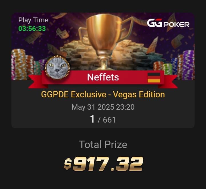 Den Mai bei GGPoker wird sich Steffen aka Neffets einrahmen. Beim GG World Festival erspielte er mehrere starke Ergebnisse, gewann Mitte des Monats das $5,50 Bounty Hunters Deepstack Turbo für $3.633. Sein starker Run gipfelte dann mit dem Sieg beim $10 GGPDE Exclusive Vegas Edition für $910 und vor allem dem $15.000-Paket für den Main Event der WSOP 2025 im Juli. „Ich kann mich nicht beschweren, wobei vor allem der Sieg für das Vegas-Package schon überraschend war“, erzählt der Hobbyspieler aus Braunschweig.
