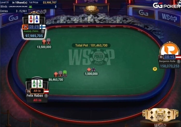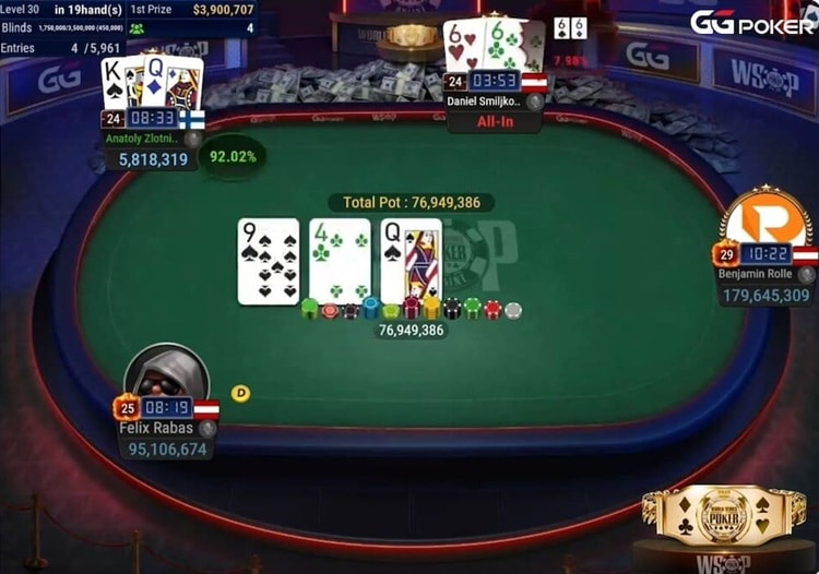 In der Folge baute der deutsche Pro seine Führung durch den Bustout von Santiago Plante ($1.063.360) deutlich aus, aber Rabas und Zlotnikov blieben dran. Der Österreicher nahm Marco Perez ($1.378.866) vom Tisch, der Russe kümmerte sich um Smiljkovic ($1.788.026). Zu dritt wurde es dann richtig spannend, denn phasenweise trennten die Spieler keine zehn Big Blinds.