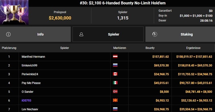 Aber das Jahr 2025 verläuft auch ohne Livepoker extrem erfolgreich für den Deutschen. Im März gewann er seinen ersten WSOP Circuit Ring samt $160.149 Prämie beim $365 Super GIANT. Und jetzt also das erste Bracelet bei der WSOP Online. Beim $2.100 6-Handed Bounty NL Hold’em wurden insgesamt $2.630.000 (1.315 Entries) ausgespielt, $315.871 gingen an Hermann, der damit jede Menge Top-Spieler, wie zum Beispiel Ben Rolle, Thomas Mühlöcker und Samuel Mullur hinter sich ließ.
