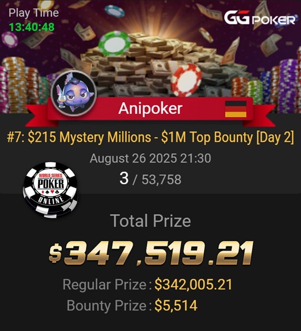 Noch deutlich höher fiel die Ausbeute von Anipoker aus. Die Freizeitspielerin erwischte beim $215 Mystery Millions $10M GTD den Lauf ihres Lebens, belegte bei 53.758 Entries den dritten Platz und bekam sensationelle $347.519,21 ausbezahlt.
