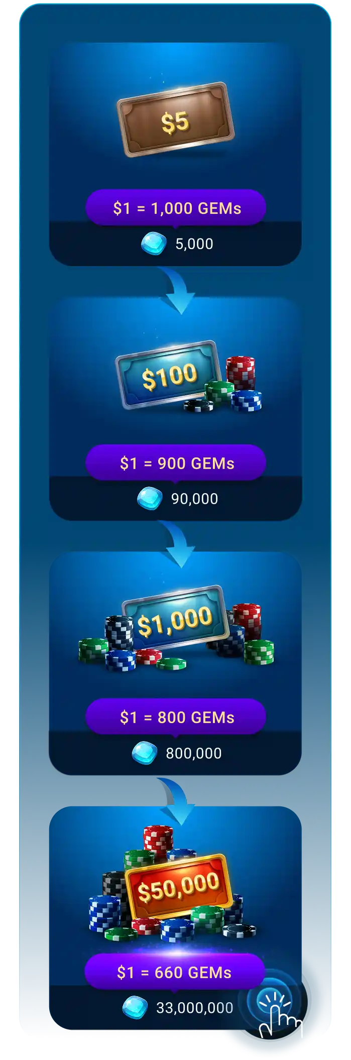 - GEMs sind eine Werbewährung und haben keinen festen Geldwert, bis ein Spieler eine Umwandlung erfolgreich abschließt
