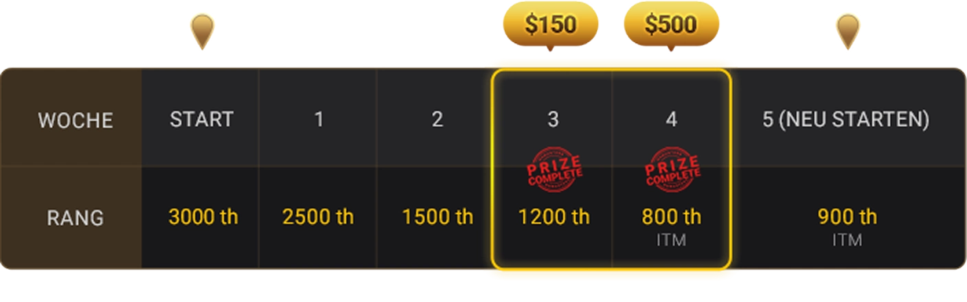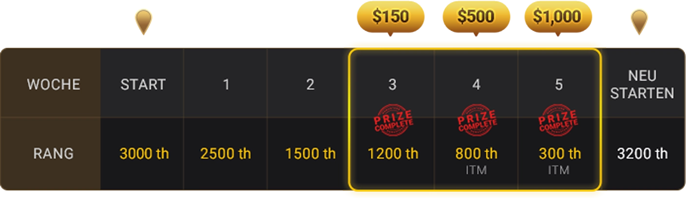 - Keine bessere Platzierung im Vergleich zur Vorwoche erreicht, oder in den Wochen 4-5 nicht In The Money (ITM) gelandet.